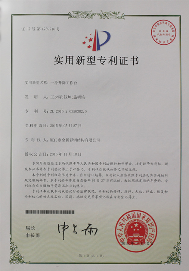 Certificado de patente de plataforma elevadora