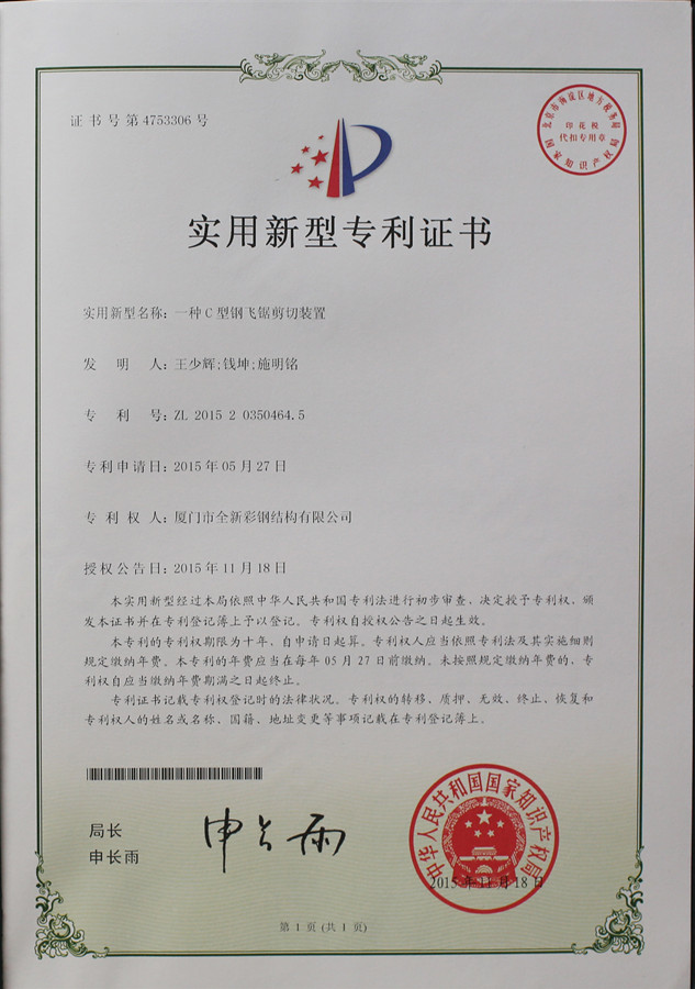 Certificado de patente de cortador de sierra